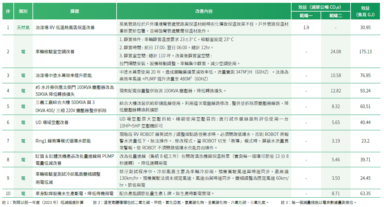 2024年共完成106件主要改善課題,降低242.6公噸碳排放(用電105件,年低減240.7公噸碳排放;瓦斯1件,年低減1.9公噸碳排放),前10大節能課題如下: