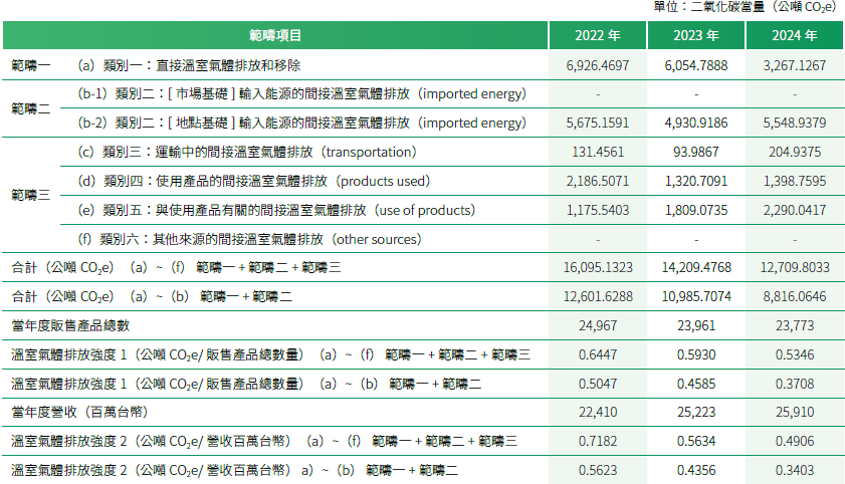 註2: 採用全球暖化潛勢GWP潛勢(AR6, IPCC 2021)比率的來源。 範疇一及範疇二統計為間接量測,使用排放係數法(溫室氣體排放係數管理表6.0.4版)、質量平衡法計算。