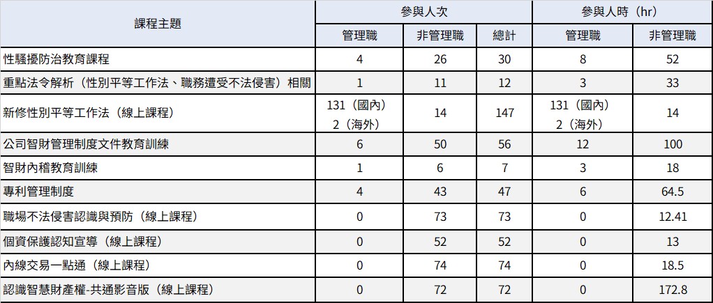 註: 2024年本公司共有286名員工接受誠信經營與法規遵循相關教育訓練,其中管理職員工為136人,占總人數的11.33%;非管理職員工為150人,占比12.5%。依地區劃分,台灣員工參訓人次為284人,占比23.67%;海外(美國地區)員工為2人,占比0.17%。