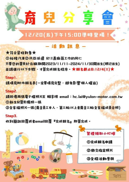 嚴前董事長凱泰曾說過,「員工快樂,企業才能引導出自動自發的企業文化」,裕隆汽車希望能打造成為一家幸福的企業,除了給付具有競爭力的薪資,每年也投入大量的資源提供各式各樣的福利與照護服務,滿足同仁於不同人生階段的需求,使員工在優質且幸福的職場工作,發展快樂且穩定的職涯與生活,我們提供食、衣、住、行、育樂、生養育關懷及獎金與津貼各福利項目,在2023年總共投入金額約6千多萬元。 裕隆汽車亦重視員工工作、生活、家庭之均衡發展,每年規劃一系列豐富的員工活動,主題涵蓋了家庭日、夏令營、節慶團隊活動、國內外旅遊、志工社公益活動及社團聯誼賽等,藉由活動的交流與分享,提升跨單位同仁的互動,增進團隊氣氛與關係,也讓職員工作忙碌之餘,仍兼顧身體健康及家庭和諧。同時裕隆汽車響應內政部單身聯誼活動,增加單身同仁踏出戶外呼吸並認識新朋友機會,公司除贊助報名費外更加碼贈送電影票,鼓勵單身同仁報名參加,為幸福加分。也針對不同年齡層、階層的同仁安排新人迎新活動、主管共識營以及退休聯誼會,使員工一入職便可透過各項活動與同仁和主管交流,凝聚向心力且瞭解未來職涯發展與退休後規劃。