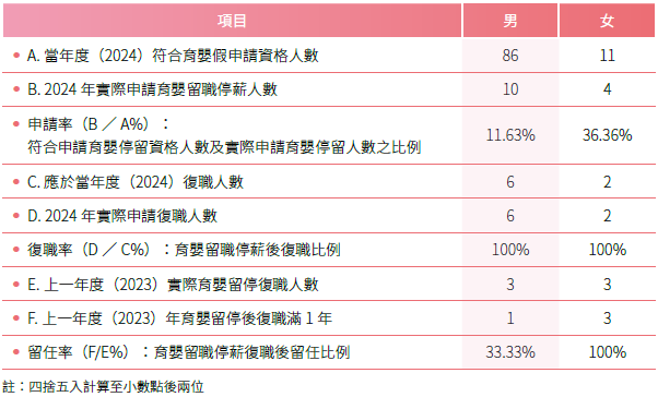 配合性別工作平等法,裕隆汽車提供優於法令的照顧與支援,例如:公司受僱 者妊娠期間,雇主給予產檢假7日,每次產檢假得以半小時為單位,薪資照給; 受僱者請「陪產檢假及陪產假」時,得於配偶妊娠期間及分娩之當日及其前後合計15日期間內,擇其中之7日請假,薪資照給。另外,裕隆汽車推動包裹式生養育關懷(懷孕階段→生產階段→養育階段),於階段中提供貼心關懷,例如 製作孕媽咪關懷手冊、補助自費檢查項目、舉辦生養育須知講座、總經理親自發放新生兒賀禮、辦理「寶貝日」分享活動等。