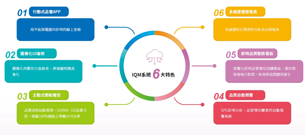 IQM 品質整合管理系統 於車身 / 油漆 / 引擎 / 車裝工場等 4 大工場建構,透過 180 個 PAD、30 台 PC 即時動態管理 251 道品質管制關卡,製程採用 GO/NO GO 品質流程站點管理方式,確保品質查檢項目 100% 檢測.圖像化的查檢畫面讓問題點具象化,透過 SPC 及時分析品質可自動預警,透過看板達到及時品情回饋,並快速產出 分析決策報表。