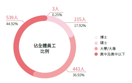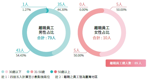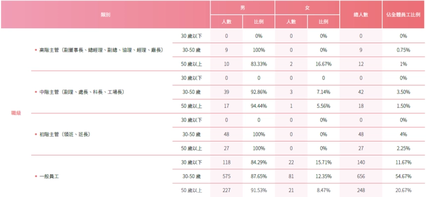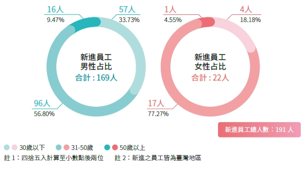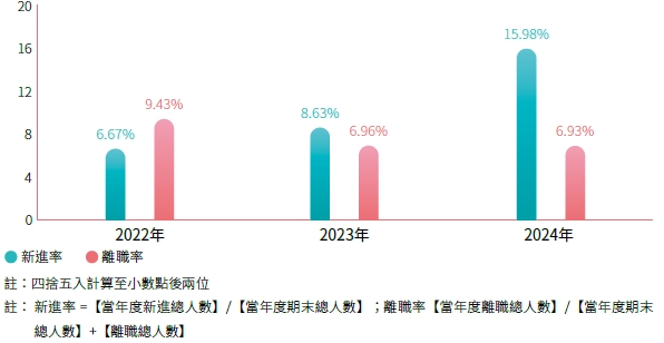 註1:計算基準:2024年12月31日現職人數,永久聘僱人員等同全職人員,目前並無「臨時員工」、「無時數保證員工」、「兼職員工」;比例皆以四捨五入至小數點後兩位。